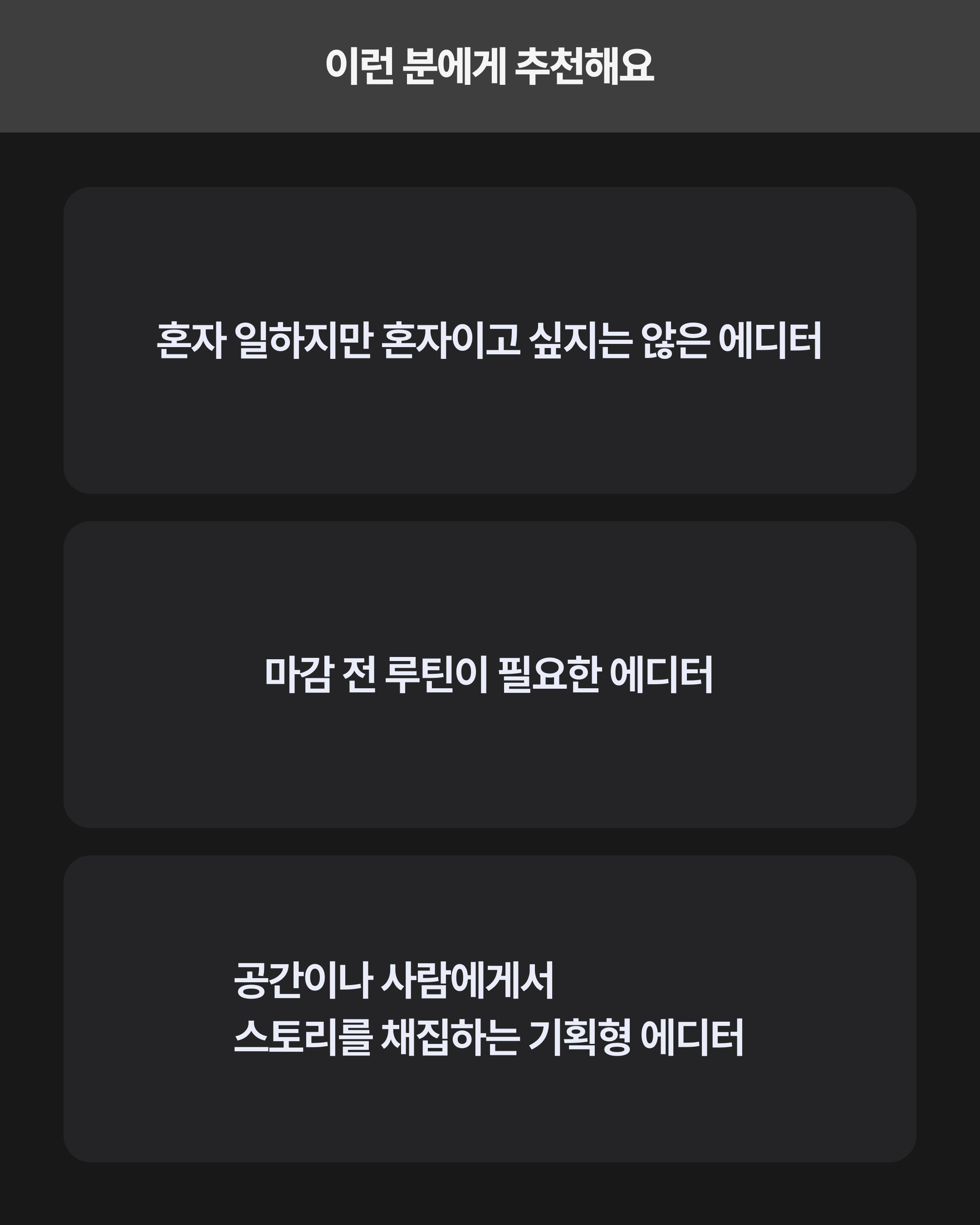 프리랜서 에디터들이 정기적으로 한 공간에 모여 얼굴을 보고, 각자의 기획안과 마감을 진행합니다. 일에 대한 이야기뿐 아니라, 혼자 일하며 느끼는 사사로운 고민들도 부담 없이 나눌 수 있도록 기획했습니다. 콘텐츠에 대해 자유롭게 이야기하고, 사람과 공간에서 얻은 현장감으로 새로운 아이디어를 발견하고 싶은 분께 추천드립니다.