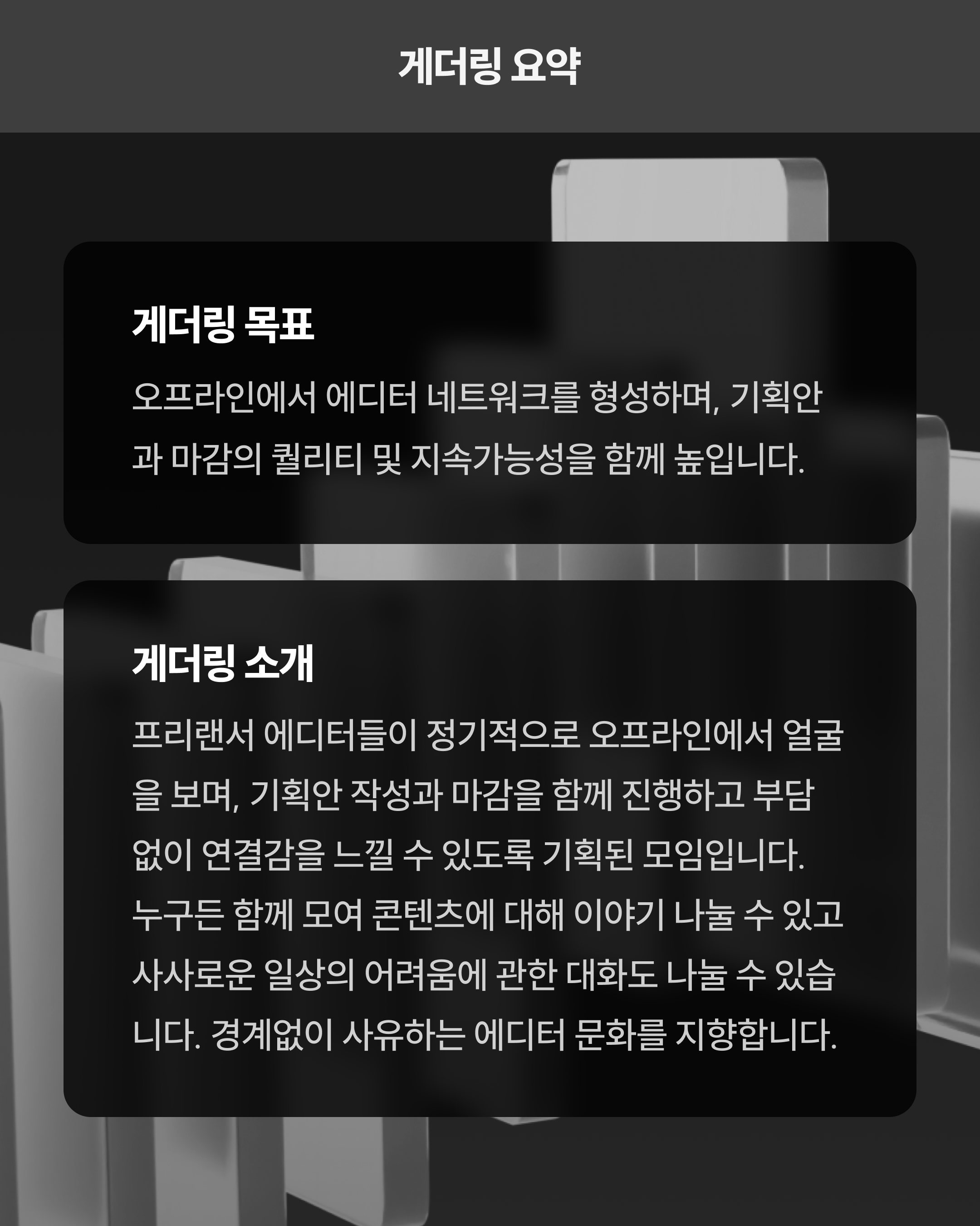 오프라인에서 에디터 네트워크를 만들며, 기획안과 마감의 퀄리티와 지속가능성을 높이는 모임입니다.