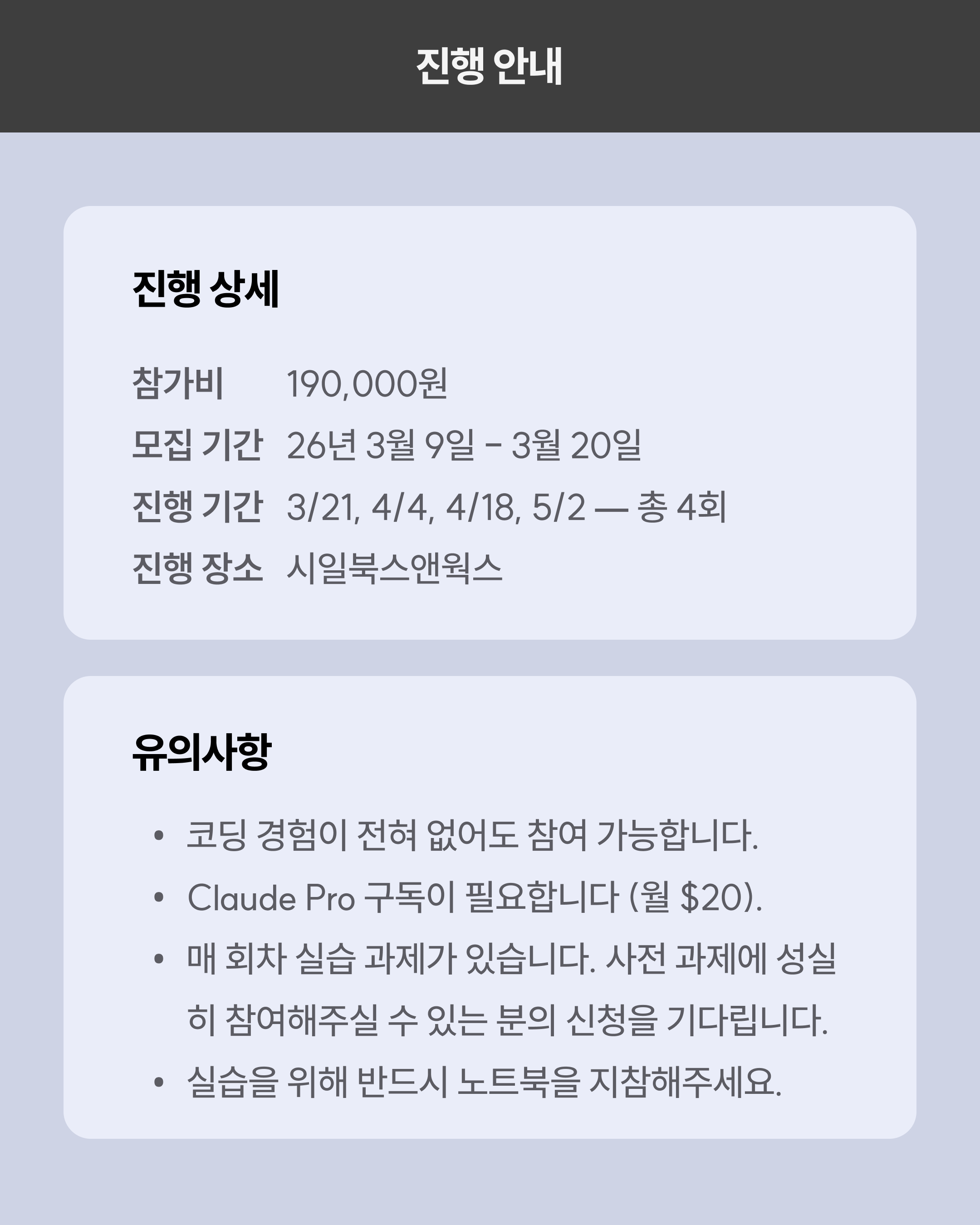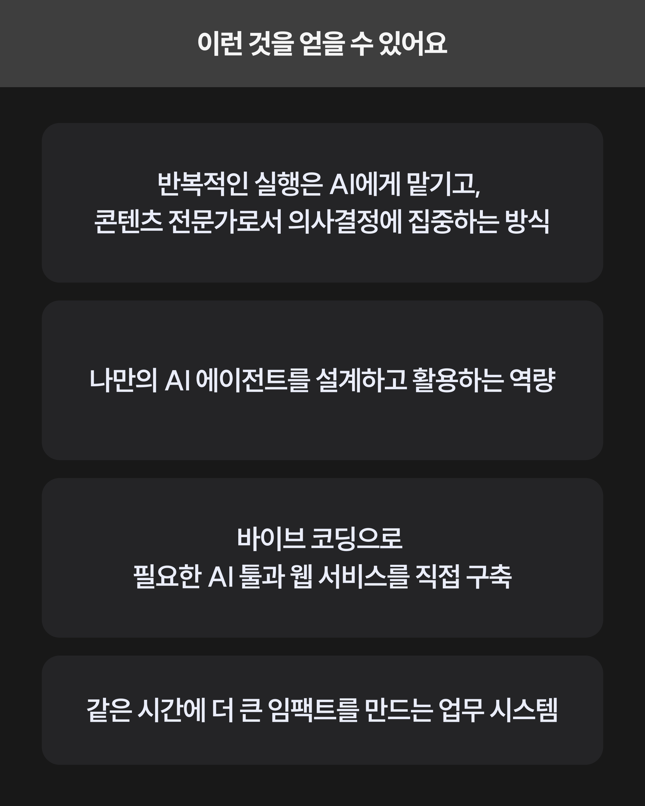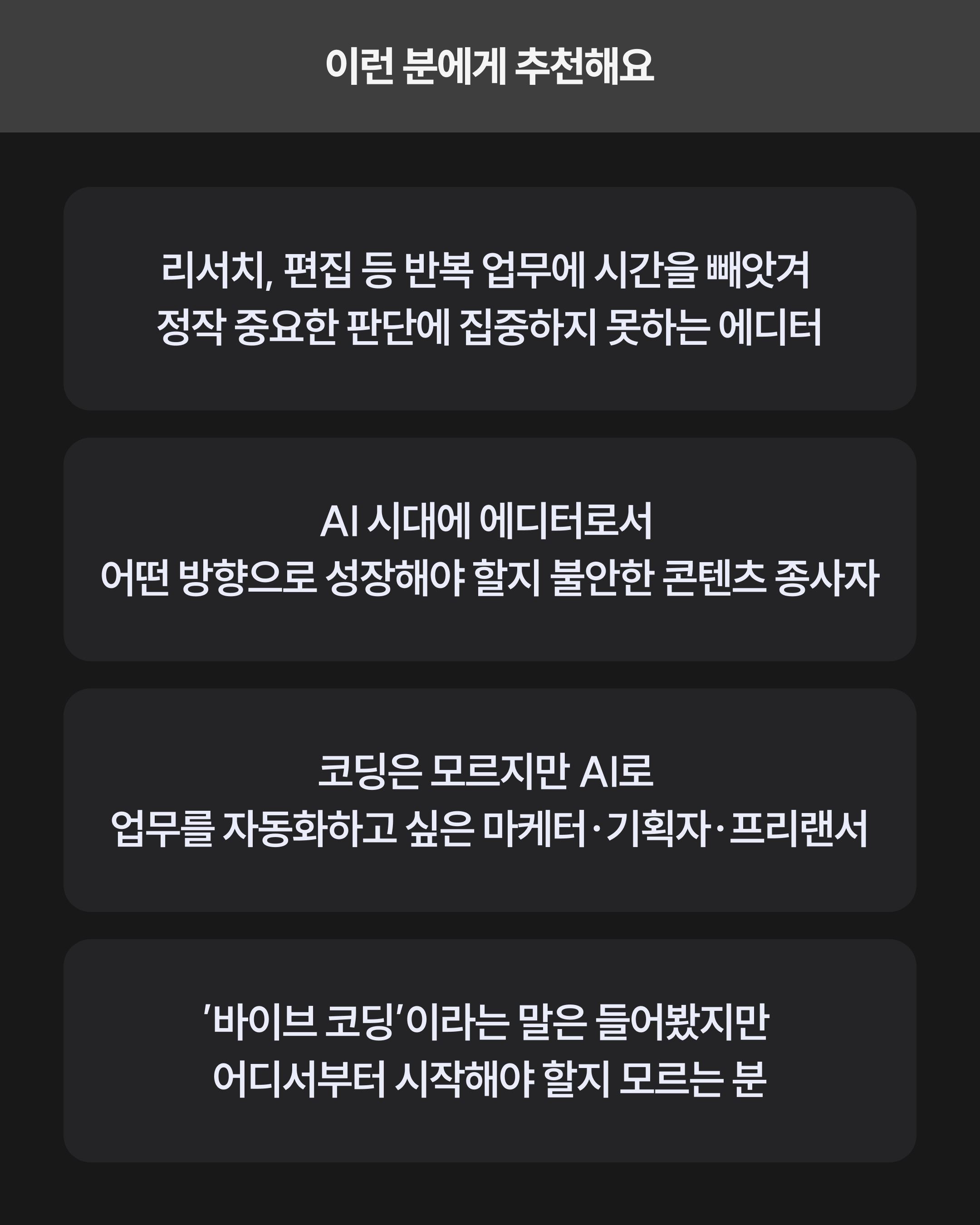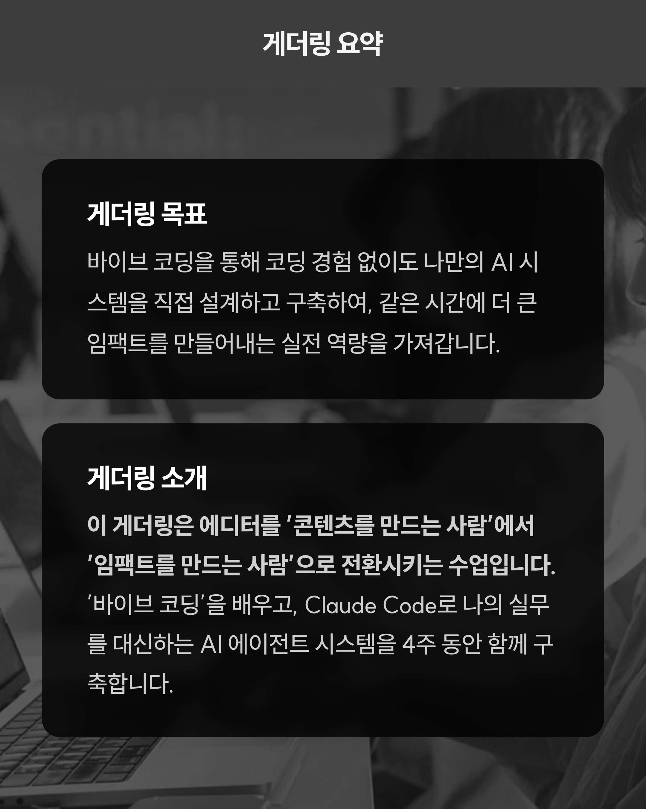 이 게더링은 에디터를 ’콘텐츠를 만드는 사람’에서 ’임팩트를 만드는 사람’으로 전환시키는 수업입니다. 코딩을 한 줄도 모르는 사람이 AI에게 말로 지시해서 자기만의 도구를 직접 만드는 ’바이브 코딩’을 배우고, Claude Code로 나의 실무를 대신하는 AI 에이전트 시스템을 4주 동안 함께 구축합니다. 반복적인 실행은 AI에게 맡기고, 나는 판단과 방향에 집중하는 법. 그것이 AI Native 에디터입니다.